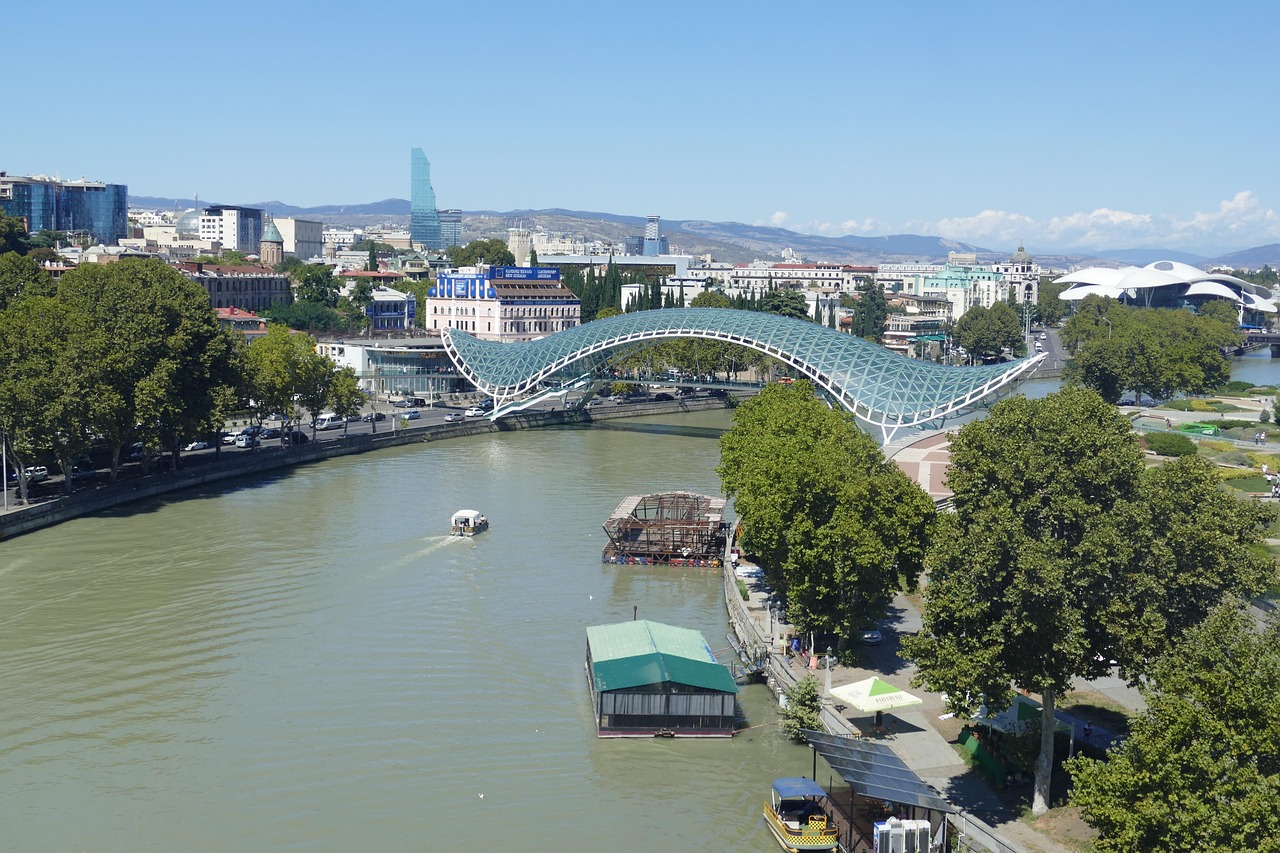 Vanaf het uitzichtpunt zie je goed hoe de oude stad, de rivier en de moderne delen van Tbilisi mooi in elkaar overlopen.